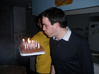 Pese a todos los impedimentos que la nieve nos ponía, llegamos al campamento base de Javi para recoger unos suministros, y como mi bici tiene cesta me tocaron las labores de porteador. Con el jamón, "chorizo blanco" (manda huevos el nombrecito para un salchichón) y un señor queso de oveja tomamos rumbo hacia la VJK para disfrutar de la cena y celebrar un cumpleaños asediado por reports y la cercanía de los exámenes. El señor Carbajo nos preparó pasta al queso azul y nueces, mientras que Monsieur Proietti era el encargado de la tarta de cumpleaños.